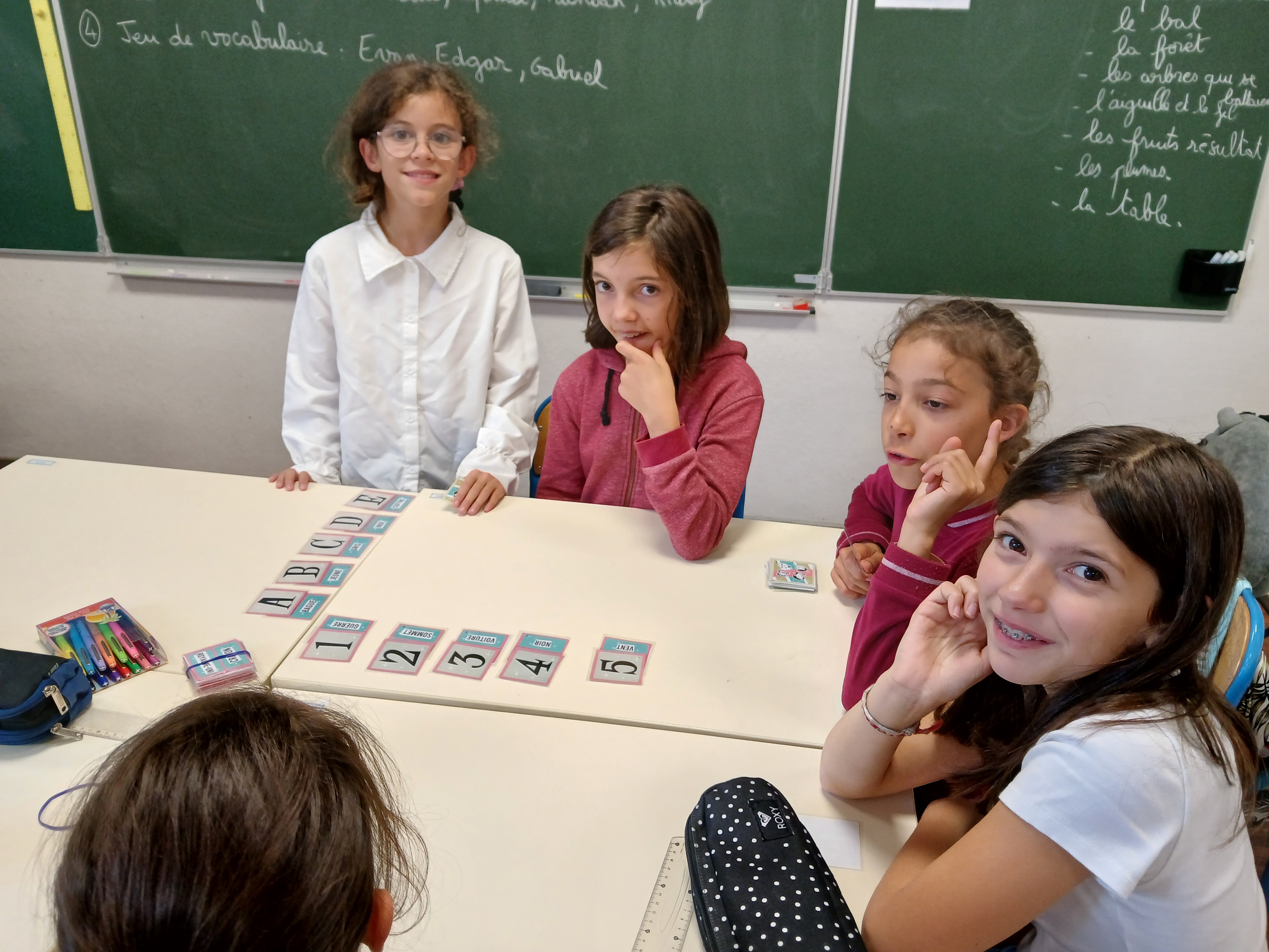 Dans la classe, nous sommes acteurs de nos apprentissages. Au début de chaque nouvelle notion, nous réalisons une phase de recherche puis nous construisons tous ensemble les outils pour mémoriser : leçon, affichages muraux. Pour nous entraîner, nous utilisons des jeux de société spécialement conçus pour la notion étudiée : Lynx des nombres décimaux, Jungle Speed des classes grammaticales ou encore Bingo des fractions.